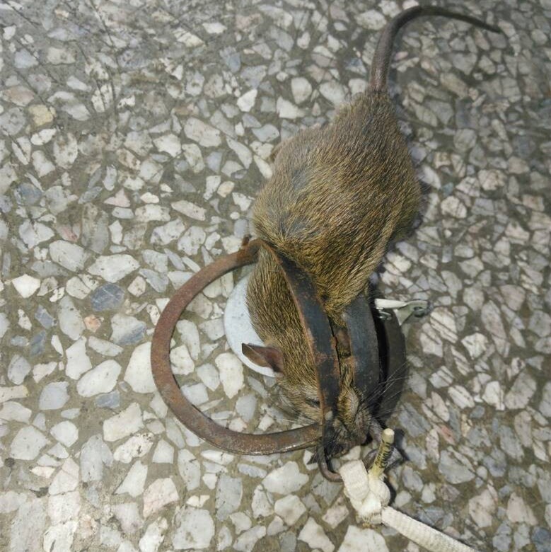 (3)放夾時要注意自身安全,壓簧桿掛上之后,手始終不要接觸前端(夾老鼠的那端)。鼠夾放好后不得有人在現場走動,鼠夾要晚放晨收,專人負責。在可能情況下,捕到老鼠后馬上重新放置。收夾時最好拿根棍子敲擊未捕到鼠、上弦待發的夾子,使壓簧桿復位后再用手撿。